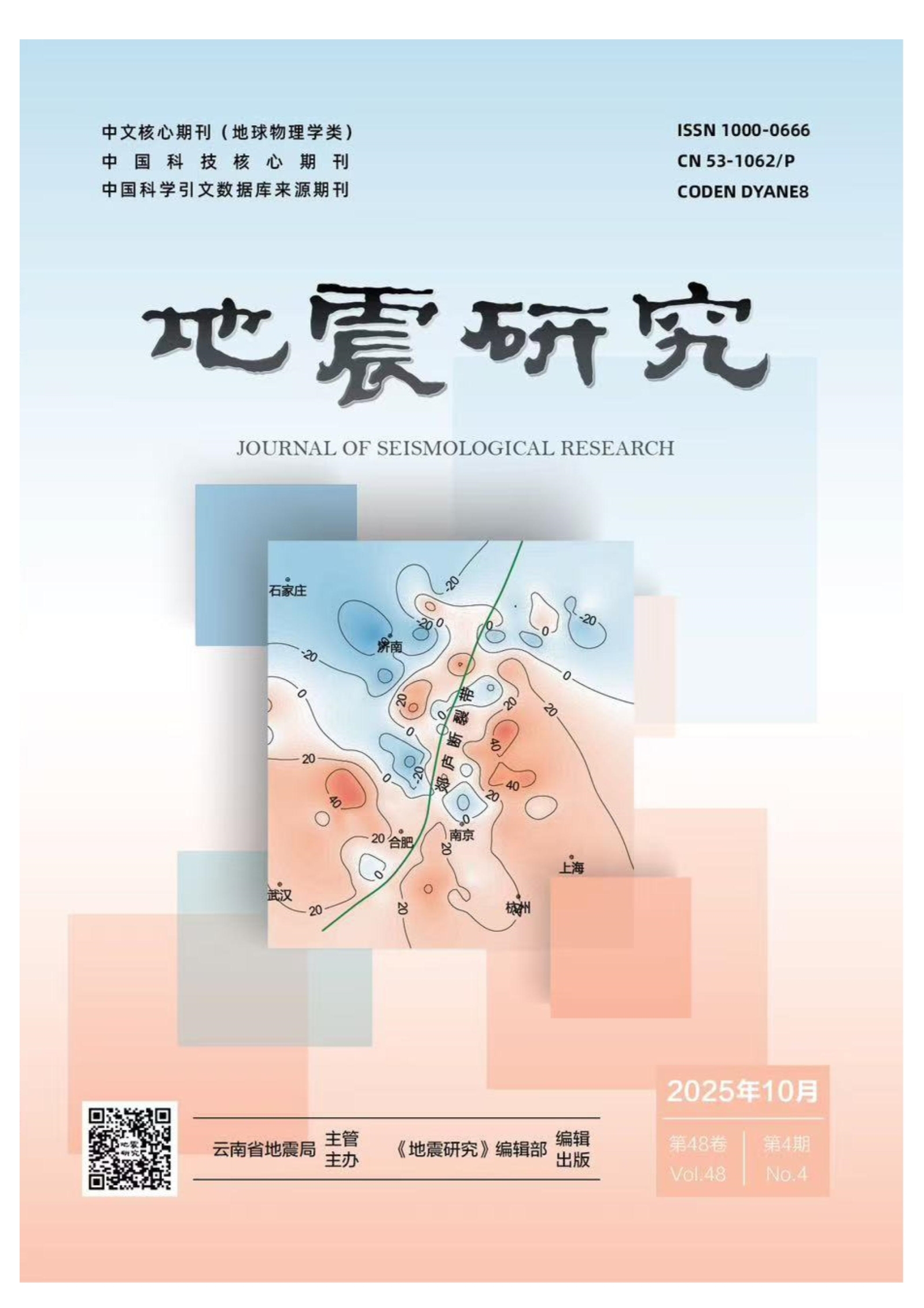 摘要:基于2015—2020年昆明地震监测中心站(以下简称“昆明站”)的gPhone连续重力观测数据,采用时频分析方法计算双频微震(DF)频段视垂直位移,利用全球地震背景噪声能量辐射模型(ASSM)正演昆明站 DF频段信号,并结合台风和邻近重力站数据,对昆明站DF频段信号异常变化特征进行研究,探讨了昆明站周边地震活动与DF频段信号之间的关系。结果显示: ① 年变化趋势显示昆明站周边 300km 范围内 Ms?5.0 地震易发生在台风频繁且DF频段视垂直位移较高的月份内,月变化趋势则显示地震易发生在视垂直位移由低转高的过程中。 ②2020 年巧家 Ms5.0 地震前DF频段信号的异常变化,并不是由巧家地震引起,而与印度洋台风有关。总结震前DF濒段信号异常特征,有助于该地区中强地震预测研究。