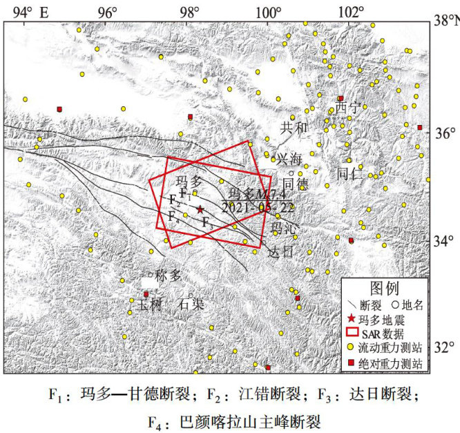 摘要:基于2019—2023年的流动重力观测资料,使用经典平差获得各测期测点重力值,得到研究区不同时间尺度的重力场变化结果;使用GAMMA软件对InSAR同震观测数据进行干涉处理,获取2021年青海玛多 Ms7.4 地震的同震形变场。结果显示:玛多 Ms7.4 地震震前研究区异常变化主要集中在震中附近,以负变化为主;地震前后1年期的重力场变化形成了“四象限”的分布特征;震后研究区重力场发生大范围的反向变化,但随着震后调整,震中区域东部的重力场变化量较西部更大,与双断层滑动模型给出的滑动量分布结果一致。玛多地震在LOS向最大位移约为 1.29m ,发震断层为走滑型;通过断层滑动分布反演得到双断层模型的滑动主要集中在20km 深度内,发震主断层最大滑移量约为 4.8m ,分支断层最大滑移量约为 2m 。联合InSAR形变场与2020—2021期重力场变化开展分析后发现,玛多 Ms7.4 地震的发震构造与重力场变化一致性较好,表明重力资料与In-SAR资料的联合应用有助于更好地分析大震发震构造及机制。