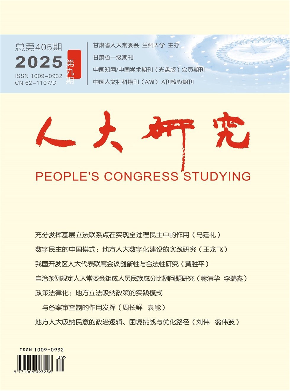 甘肃省人大常委会主办的《人大研究》专门研究人民代表大会制度的学术期刊。本刊宗旨:研究人大制度理论,开阔人大工作视野,增强公民法制意识。