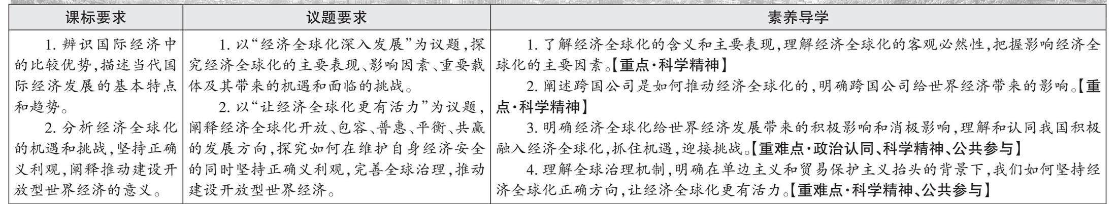 [教材“探究与分享1、2、3、4”] 【引思】什么是经济全球化?经济全球化有哪些主要表现?什么是比较优势?存在比较优势的情况下应如何交易? 【导学】 1.经济全球化的含义及其表现 (1)经济全球化的含义 当今世界经济的一个显著特征是商品、服务及技术、资金、劳务等要素,通过日益频繁的国际贸易、国际金融在全球范围内迅速流动和广泛配置,世界经济出现了高度融合的局面,这就是经济全球化。 (