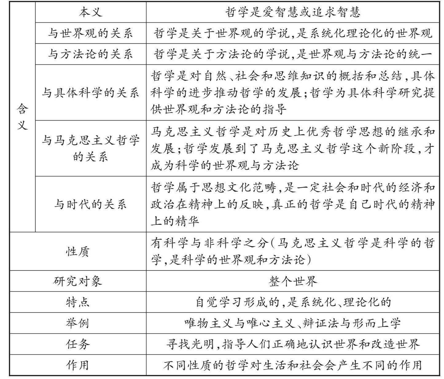 [梳理][考点] 一 全面把握哲学 二 图解哲学基本问题和基本派别的关系 三 全面理解马克思主义哲学 1.马克思主义哲学产生的历史条件:(1)阶级基础:无产阶级的产生和发展。(2)直接理论来源:德国古典哲学,主要是黑格尔的辩证法和费尔巴哈的唯物主义。(3)自然科学前提:以细胞学说、能量守恒和转化定律、生物进化论这三大发现为代表。(4)社会科学前提:近代社会科