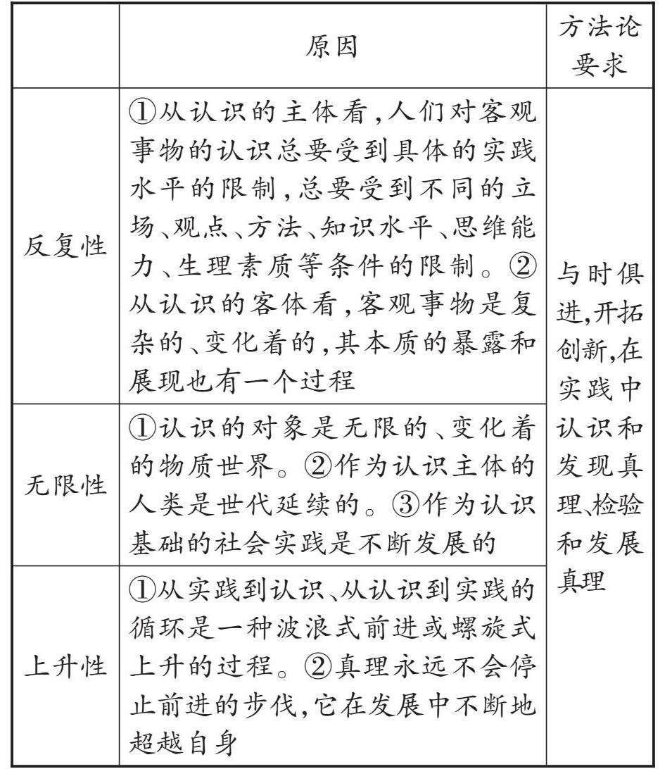 考点梳理 一 实践与认识的辩证关系 1.原理内容 (1)实践决定认识:实践是认识的来源;实践是认识发展的动力;实践是检验认识的真理性的唯一标准;实践是认识的目的。 (2)认识反作用于实践:正确的认识、科学理论对实践具有巨大的指导作用,错误的理论会把实践引向歧途。 2.方法论要求 (1)坚持实践第一的观点,积极投身实践,在实践中认识和发现真理,在实践中检验和发展真理。 (2)重