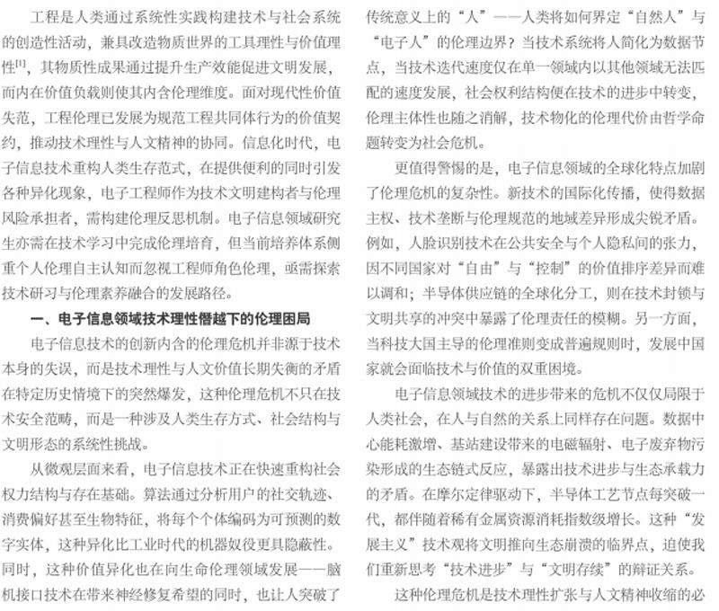[摘要]在科技革新的背景下,工程实践的价值属性引发诸多现代性困境。本文聚焦电子信息领域,剖析其技术理性与人文价值失衡的根源,指出该领域的伦理危机源于技术理性僭越伦理边界。随后重构现代电子工程师的社会责任,提出其应具备技术治理的谦逊主义、辩证思维与伦理自觉,从技术执行者升华为文明建构者。针对电子信息领域研究生,本文构建了“伦理意识-技术人文-技术治理-职业美德”的发展框架。本文不仅是对工程伦理实践的